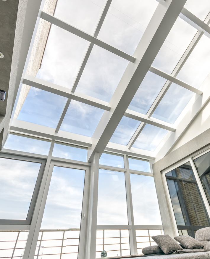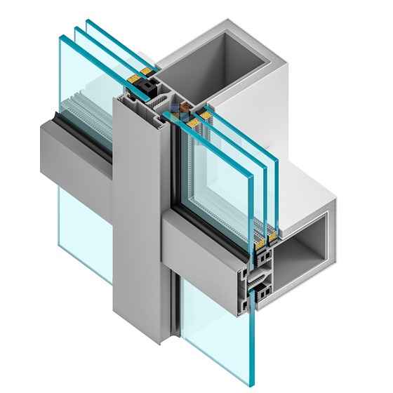 Интеграция двухкамерного 50-мм стеклопакета с аргоном и энергосбережением. Дополнительная герметизация швов и щелей атмосферостойким герметиком для структурного остекления. Утепление и декор бесшовными коробами EWIC®